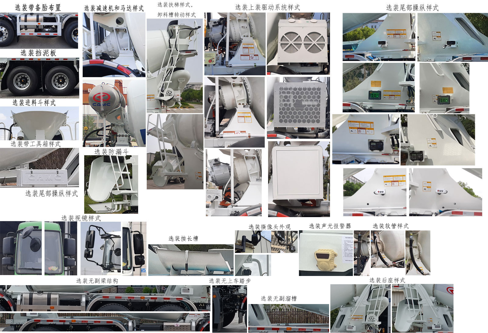 | 备注 | 1.选装带备胎;2.选装减速机马达;3.选装扶梯样式卸料槽转动样式;4.选装上装驱动系统样式;5.选装尾部操纵样式;6.选装挡泥板;7.选装进料斗;8.选装工具箱样式;9.选装尾部操纵样式;10选装视镜样式;11选装接长槽;12.选装摄像头外观;13选装声光报警器;14.选装软管样式;15选装无副梁样式;16.选装无上踏步;17.选装无副溜槽;18.选装后座样式。 | ||||||||||