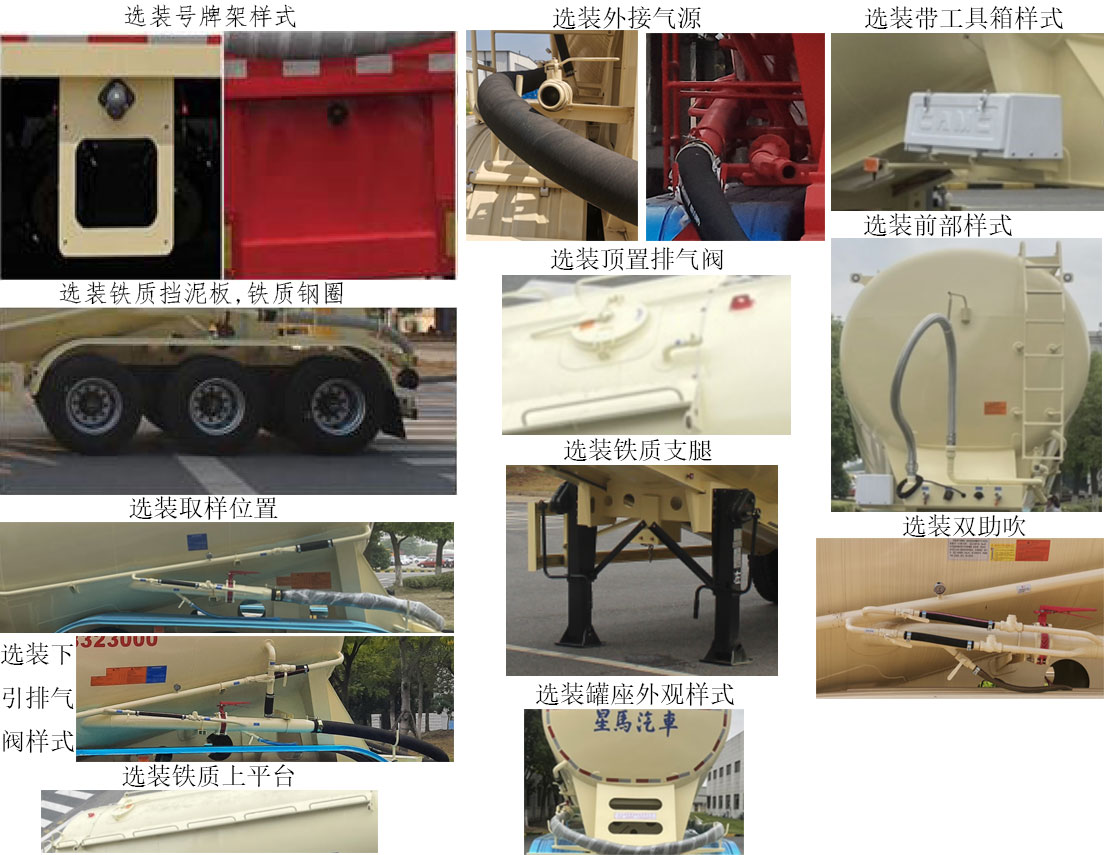 | 备注 | 1.选装号牌架样式;2.选装外接气源;3.选装带工具箱样式;4.选装铁质挡泥板、铁质钢圈;5.选装顶置排气阀;6.选装前部样式;7.选装取样位置;8.选装铁质支腿;9.选装双助吹;10.选装下引排气阀样式;11.选装铁质平台;12选装罐座外观样式;13.车长/牵引销到车辆最前端距离/轴距/后悬(mm)/牵引销中心轴线到半挂车最后端水平距离/半挂车前回转半径对应关系分别为:8500/450/4650+1310+1310/780/8050/860 | ||||||||||