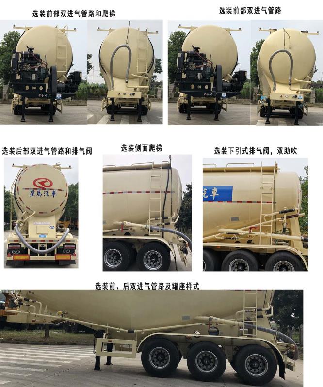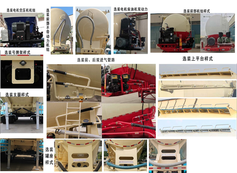 | 备注 | 该样车为不带空压机组传动方式,可选装多种空压机柴油机组以及空压机电机组、选装前部爬梯、后部爬梯、侧面爬梯、上平台、罐座、支腿、排气阀、双助吹、号牌架样式及前后双进气管路样式. 车长/牵引销到车辆最前端距离/轴距/后悬(mm)/牵引销中心轴线到半挂车最后端水平距离/半挂车前回转半径对应关系分别为:8650/460/4750+1310+1310/820/8190/820;8650/460/4750+1350+1350/740/8190/820;9150/960/4750+1310+1310/820/8190/1780;9150/960/4750+1350+1350/740/8190/1780. | ||||||||||