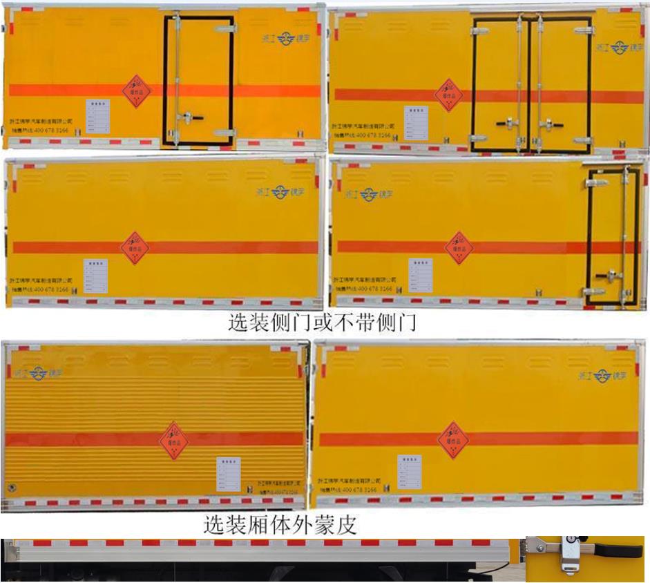 | 备注 | 随底盘选装不同风格中网、侧窗、前部灯具及前保险杠,厢体两侧选装不同形式侧开门及开门位置或不带侧门,选装厢体外蒙皮,选装不同风格锁具,选装1.4、1.5危险品标志板.选装抗暴容器,选装抗爆容器时,车厢需加隔断,抗爆容器安装在隔舱内.液压尾板可不装. | ||||||||||