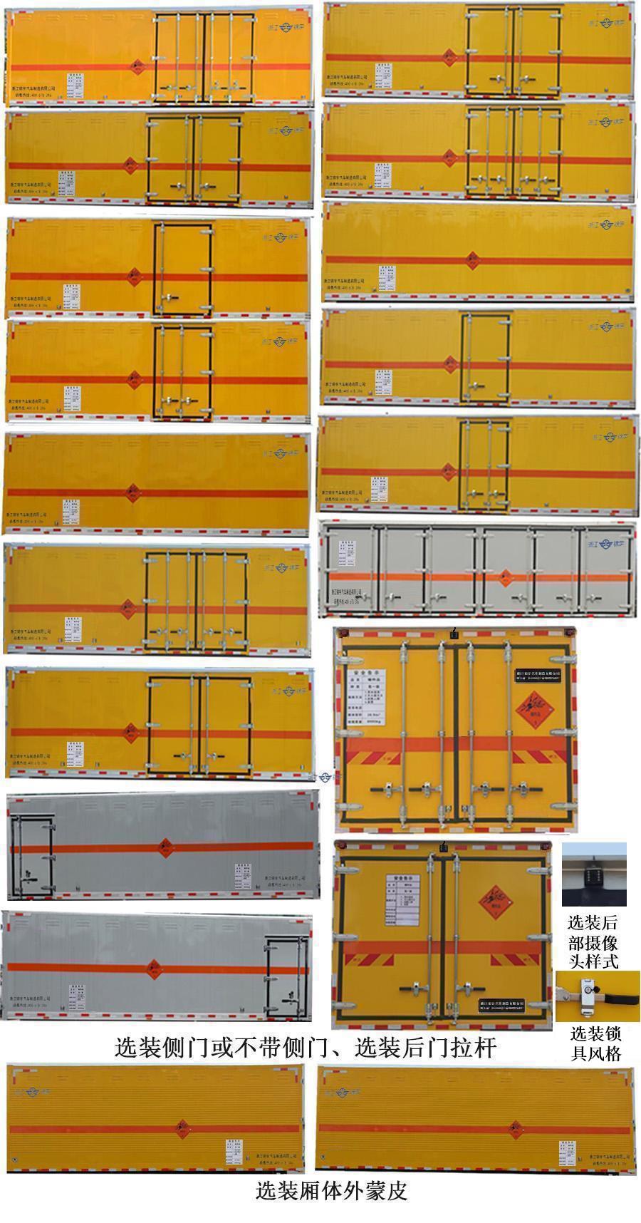 | 备注 | 厢体两侧选装不同形式侧开门及开门位置或不带侧门,选装厢体外蒙皮,选装后门双/四锁杆结构,选装不同风格锁具,后下部选装双导静电拖地带,选装1.4、1.5危险品标志板,选装后部摄像头样式.选装抗爆容器,选装抗爆容器时,车厢需加隔断,抗爆容器安装在隔舱内.随底盘选装裙板,随底盘选装卧铺侧窗,随底盘选装前保险杠及前部灯具,随底盘选装后视镜;随底盘选装遮阳罩.液压尾板可不装. | ||||||||||
