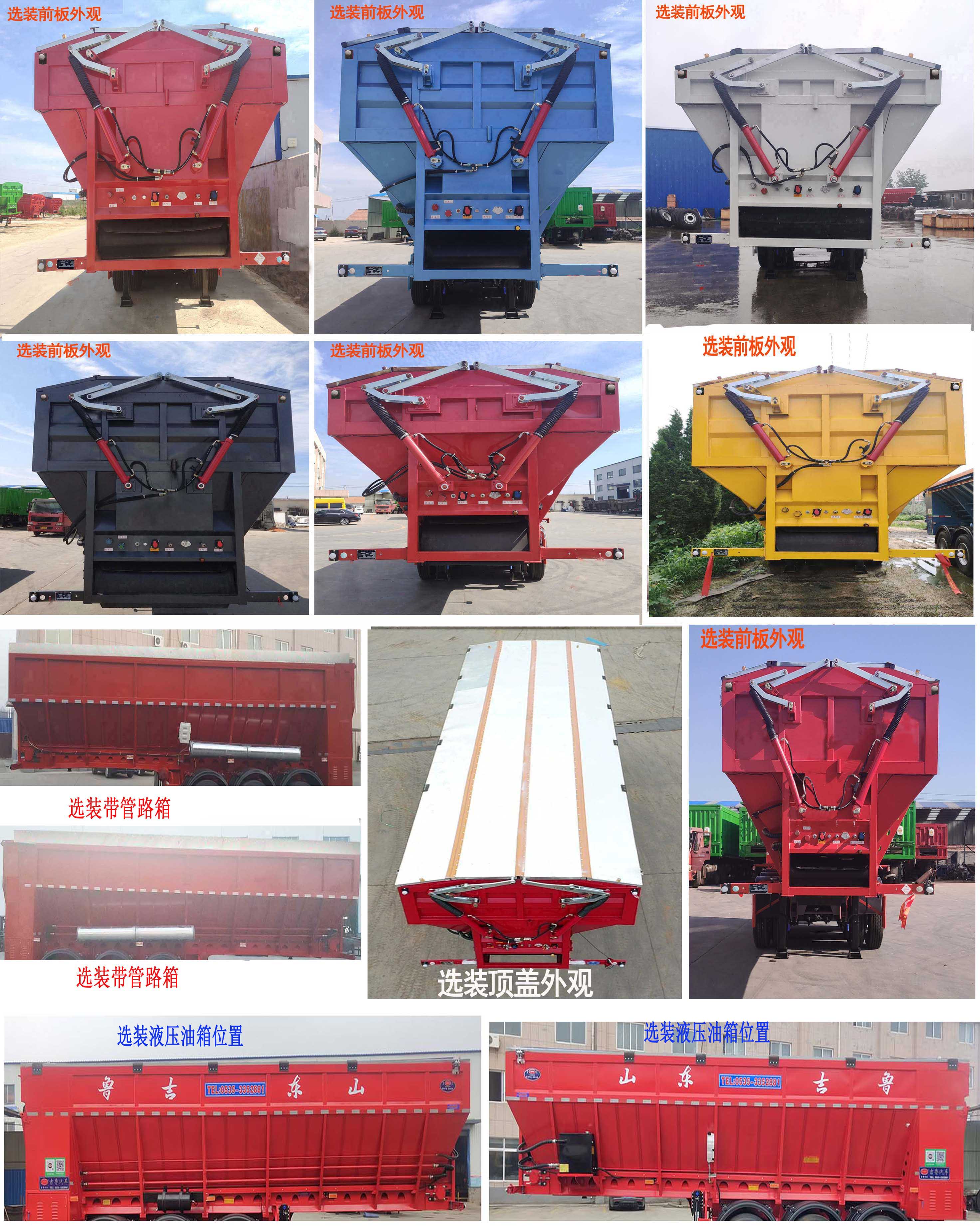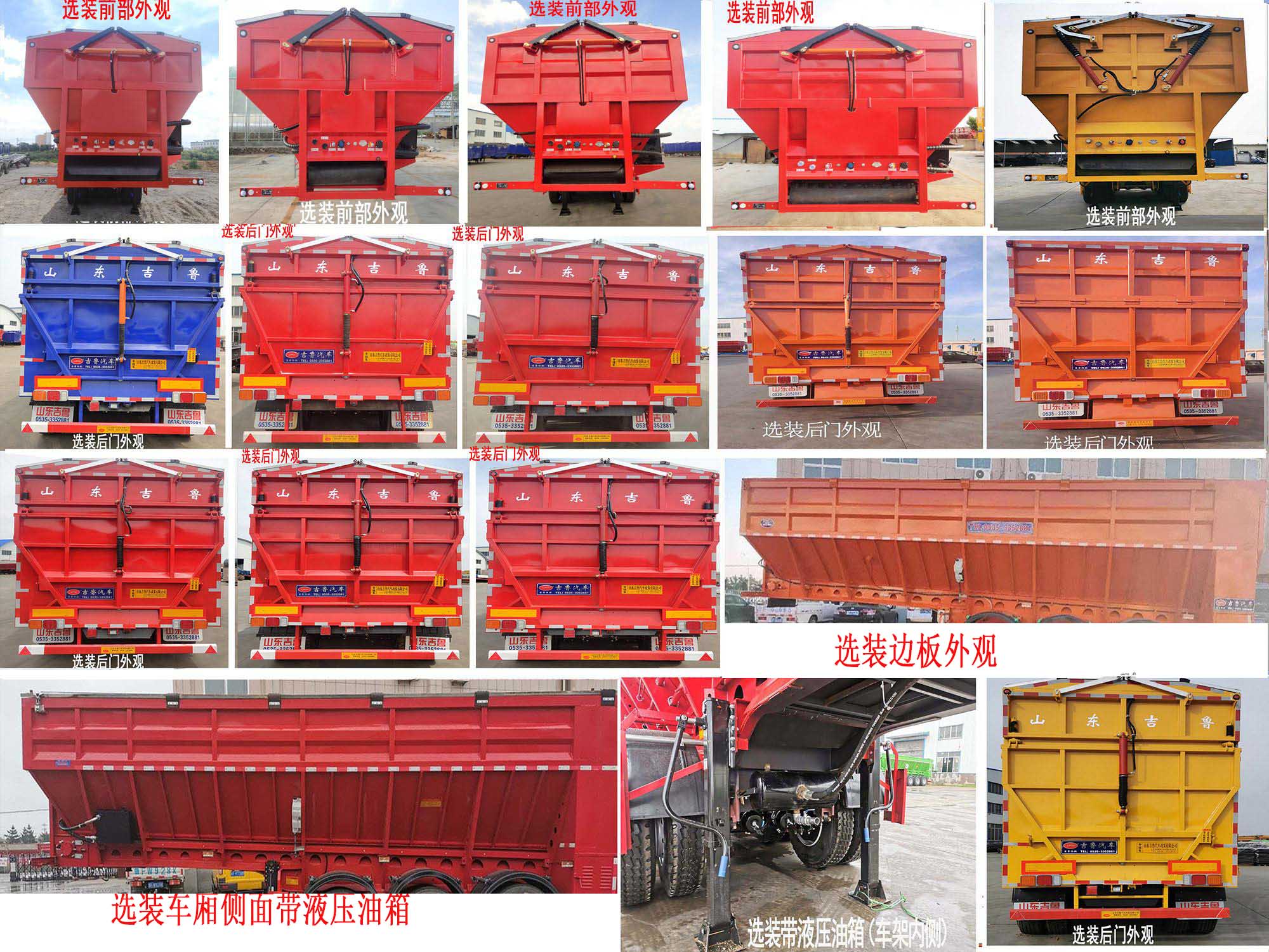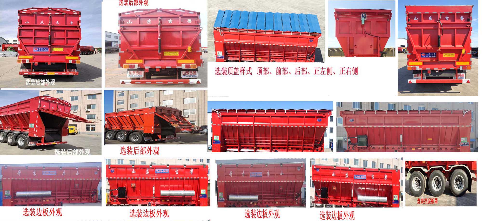 | 备注 | 1:该产品不能举升自卸,无自卸举升装置,该车顶部用硬质环保盖封闭;顶盖可开启,开启方式分为液压式或机械式;选装硬质环保盖结构。卸货方式为传送带传送;车厢底部中间为橡胶传送带结构,用于清理粮食。后门不可整体开启;选装后门外观。选装边板外观。选装带和不带管路箱。选装带和不带液压油箱,选装液压油箱安装位置。选装挡泥板罩。2:外廓尺寸长度与牵引销中心轴线到半挂车最后端水平距离的对应关系(mm)为:9500/8100;9000/7820;8500/7320. | ||||||||||