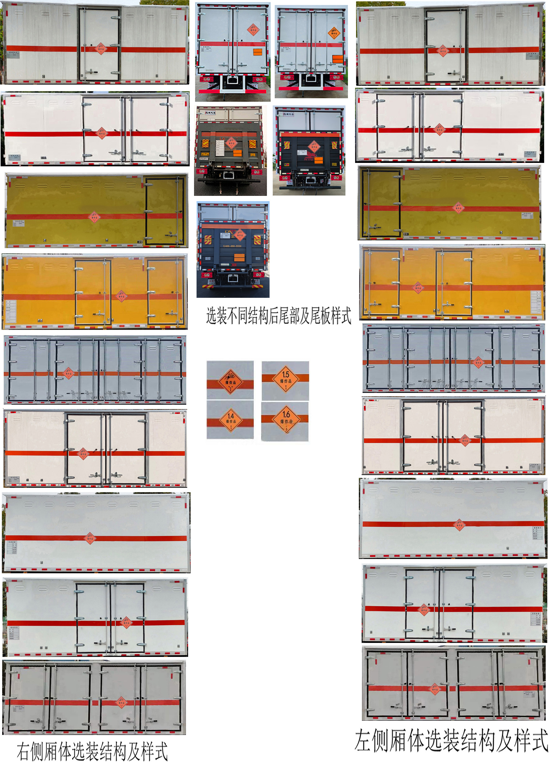 | 备注 | 选装厢体结构及样式,选装不同结构后尾部及尾板样式,选装危险标识.随底盘选装驾驶室,随底盘选装驾驶室前脸,随底盘选装底盘布局. | ||||||||||