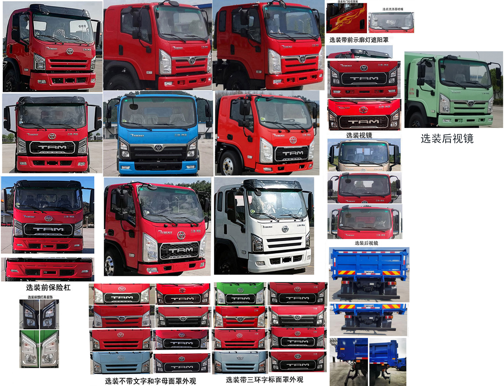 | 备注 | 选装不同货箱样式;选装各种货箱横竖筋数量和货箱门铰链样式组合;选装多种不同结构的环保顶盖或折叠式篷布顶盖;所有车厢左右两侧的吊装块可取消;随底盘选装排半驾驶室;选装侧风窗;选装面罩及侧面拉花;选装撞色面罩;选装后门锁钩和链条;选装后视镜;该车型可选装直接供电的ETC车载装置;选装无备胎;选装前保险杠;选装前部灯具装饰;选装洗涤器喷嘴样式;驾驶室准乘人数和额定载质量一一对应.参数对应关系(mm)总长/轴距/后悬:一.6155,6075,6025,5925,5905,5825/3250/1275/1630,1550,1500,1400,1380,1300;二.6305,6255,6125,6075,6025,5925/3400/1275/1630,1580,1450,1400,1350,1250;三.6505,6275,6125,6075/3550/1275/1680,1450,1300,1250;四.6075/3550/1490/1035;五.6470,6770/3650/1275/1545,1845;六.6770,6990/3800/1275/1695,1915. | ||||||||||