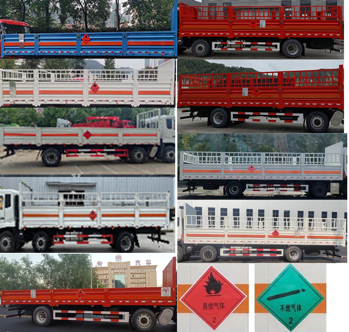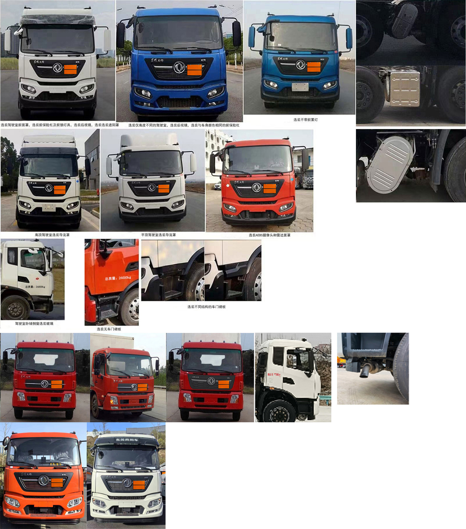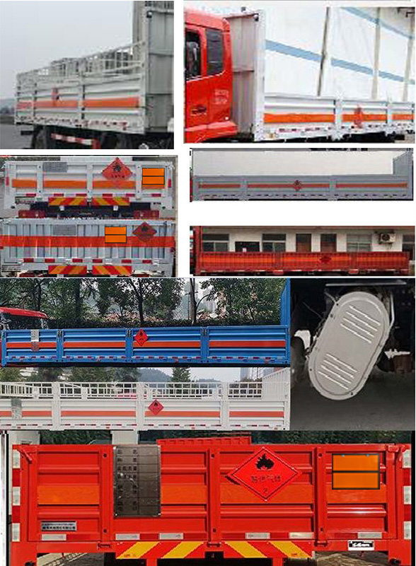 | 备注 | 随底盘选装驾驶室样式;选装高顶驾驶室;选装导流罩;选装驾驶室侧面样式;选装发动机后处理装置;选装货箱栏板结构样式;选装易燃/不燃气体标签;选装货箱箱体结构。发动机型号/发动机生产企业/辅助制动装置型号/辅助制动装置生产企业对应关系如下:B6.2NS6B245/东风康明斯发动机有限公司/DCEC-B6/D7-EB/浙江康和机械科技有限公司,DDi75E260-60/东风商用车有限公司/DFCVFDJZD/东风商用车有限公司,B6.2NS6B260/东风康明斯发动机有限公司/DCEC-B6/D7-EB/浙江康和机械科技有限公司,DDi75E300-60/东风商用车有限公司/DFCVFDJZD/东风商用车有限公司。外廓尺寸长/货厢栏板内尺寸长/前悬/轴距/后悬/车辆前轴到货箱前壁内侧的距离对应关系(mm):10100/7700/1430/1995+4200/2475/-80,11000/8600/1430/1995+5000/2575/-80,12000/9500/1430/1995+5300/3275/20,12000/9600/1430/1995+5300/3275/-80,12000/9800/1430/1995+5300/3275/-280。发动机为B6.2NS6B245时整车长度仅可选用11000mm或10100mm. | ||||||||||