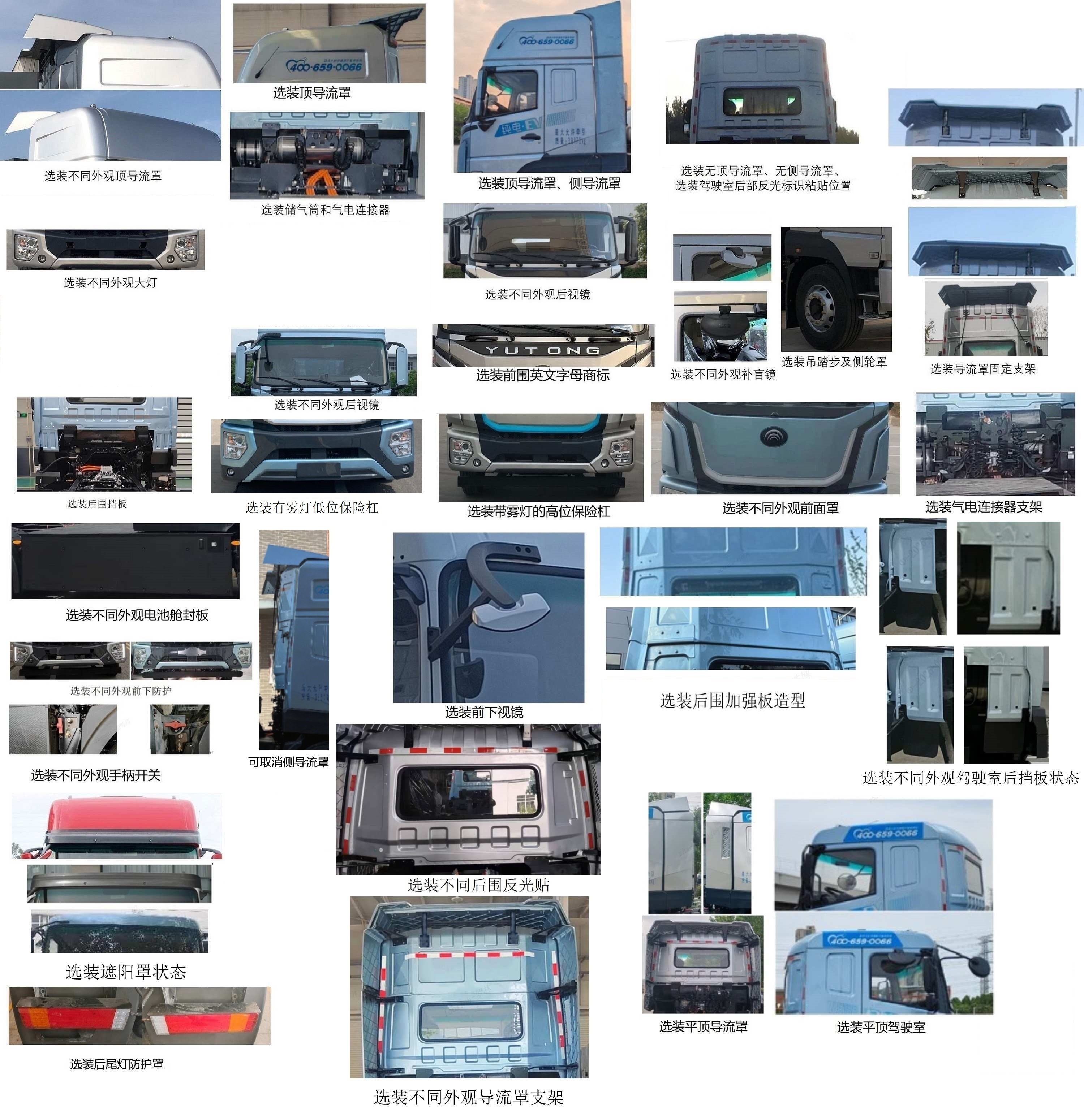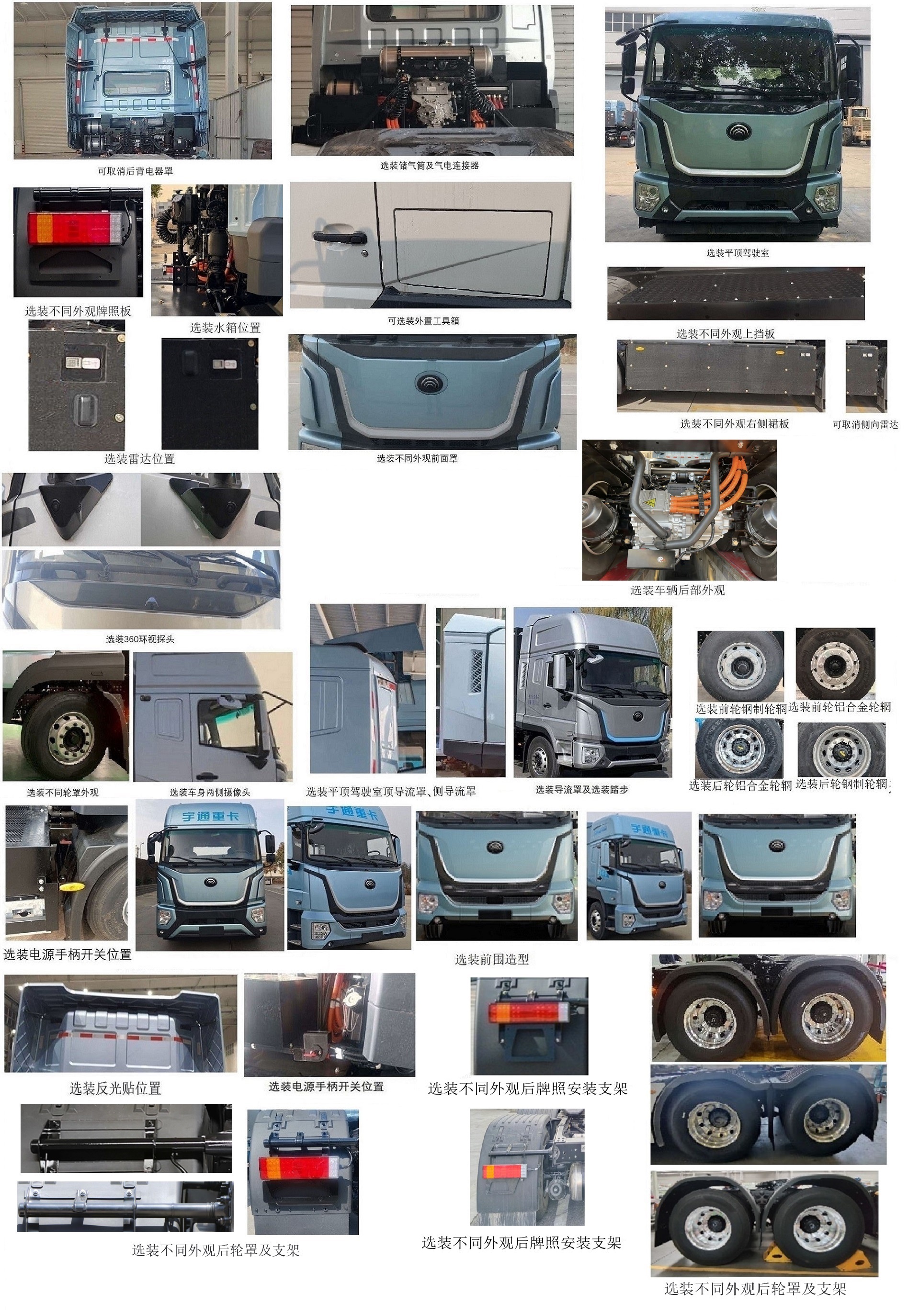 | 备注 | 1.选装不同外观顶导流罩、选装顶导流罩、选装储气筒和气电连接器、选装顶导流罩、侧导流罩、选装无顶导流罩、无侧导流罩、选装驾驶室后部反光标识粘贴位置、选装不同外观大灯、选装不同外观后视镜、选装吊踏步及侧轮罩、选装导流罩固定支架、选装后围挡板、选装前围英文字母商标、选装不同外观补盲镜、选装吊踏步及侧轮罩、选装导流罩固定支架、选装有雾灯低位保险杠、选装带雾灯的高位保险杠、选装不同外观前面罩、选装气电连接器支架、选装不同外观电池舱封板、选装不同外观前下防护、选装前下视镜、选装后围加强板造型、选装不同外观驾驶室后挡板状态、选装不同外观手柄开关、选装遮阳罩状态、可取消侧导流罩、选装不同后围反光贴、选装后尾灯防护罩、选装不同外观导流罩支架、选装平顶导流罩、选装平顶驾驶室、可取消后背电器罩、选装储气筒及气电连接器、选装不同外观牌照板、选装水箱位置、可选装外置工具箱、选装不同外观上挡板、选装不同外观右侧裙板、可取消侧向雷达、选装雷达位置、选装不同外观前面罩、选装 360 环视探头、选装车辆后部外观、选装不同轮罩外观、选装车身两侧摄像头、选装平顶驾驶室顶导流罩、侧导流罩、选装导流罩及选装踏步、选装电源手柄开关位置、选装前围造型、选装反光贴位置、选装不同外观后牌照安装支架、选装不同外观后轮罩及支架、选装前轮钢制轮辋、选装前轮铝合金轮辋、选装后轮铝合金轮辋、选装后轮钢制轮辋;2.整备质量(kg)/准拖挂车总质量(kg)/鞍座最大承载质量(kg)对应关系:10700/38170/14170,11000/37870/13870,11300/37570/13570. | ||||||||||