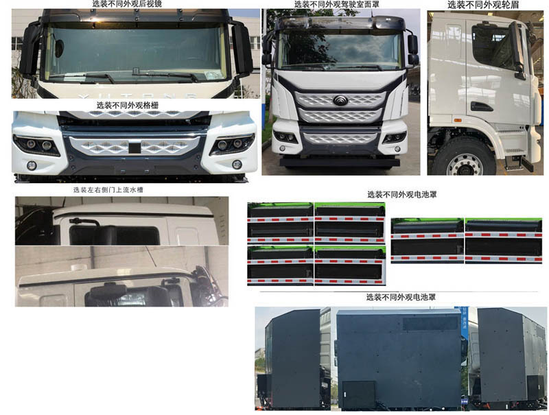 | 备注 | 1.可选装不同外观小爬梯、不同外观上装爬梯、不同外观轮罩、不同外观进料口、不同外观下料槽、不同外观接料斗、不同外观上装水管布置、不同外观上装电机、不同外观装料斗胶皮、不同形式副车架;2.可选装不同外观后视镜、不同外观驾驶室面罩、不同外观轮眉、不同外观格栅、左右侧门上流水槽、不同外观电池罩;可取消前围英文字母商标;3.可选装后爬梯作业灯仅在驻车工作时使用. | ||||||||||
